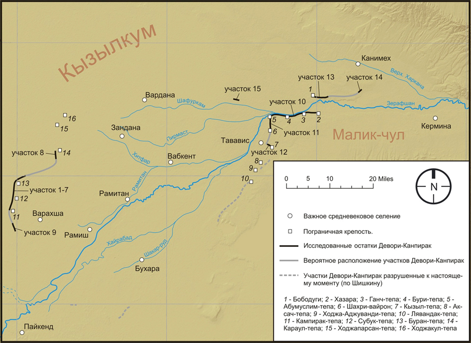 Но среди них широкой известностью в исторических источниках, монументальностью, государственными масштабами строительства, стратегическим значением, сохранностью, особо выделялась Великая оазисная стена Бухары -Кампир девор.