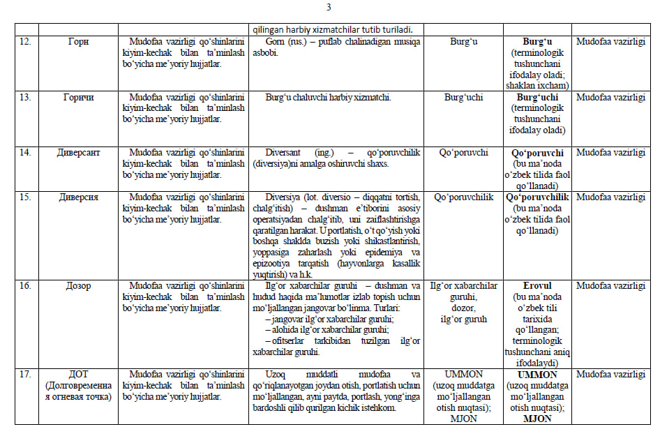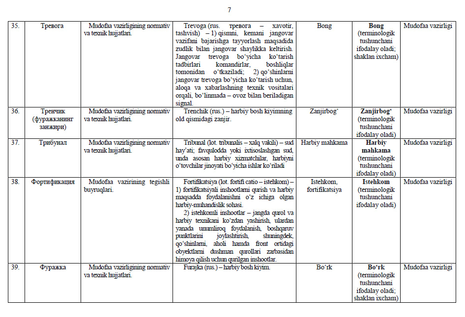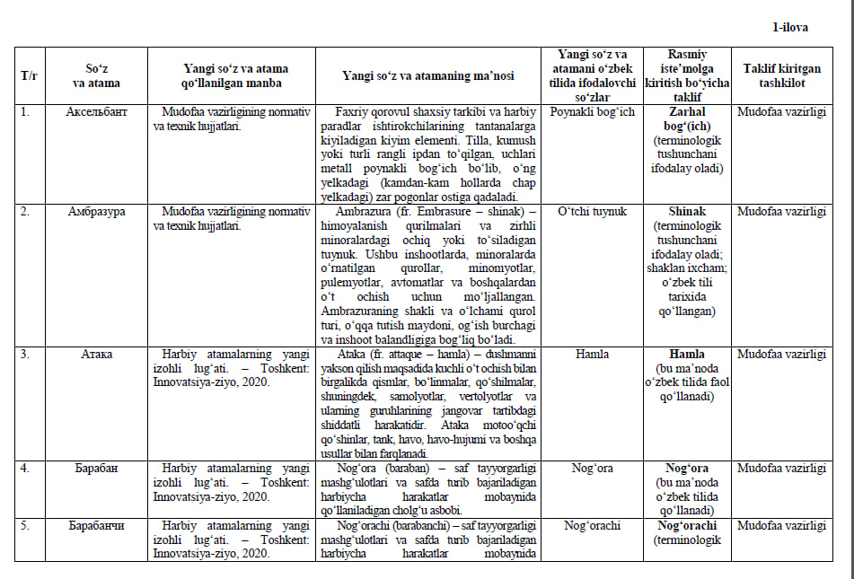Ishchi organ galdagi taqdim etilayotgan atamalarning milliy muqobillari boʻyicha boshqa fikr va mulohazalarni ham mamnuniyat bilan qabul qiladi va koʻrib chiqadi.