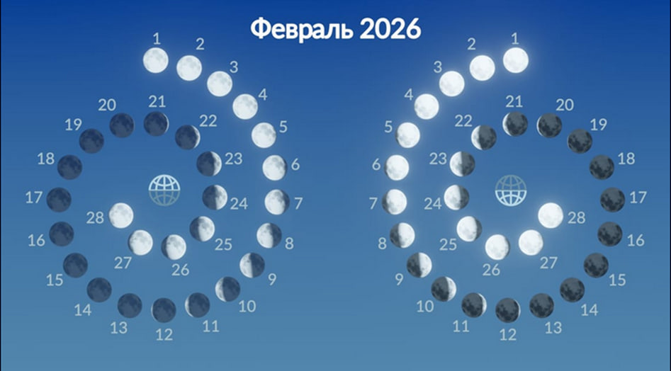 Oyning 2026-yil fevral oyida Shimoliy va Janubiy yarim sharlarda kunma-kun koʻrinishi.